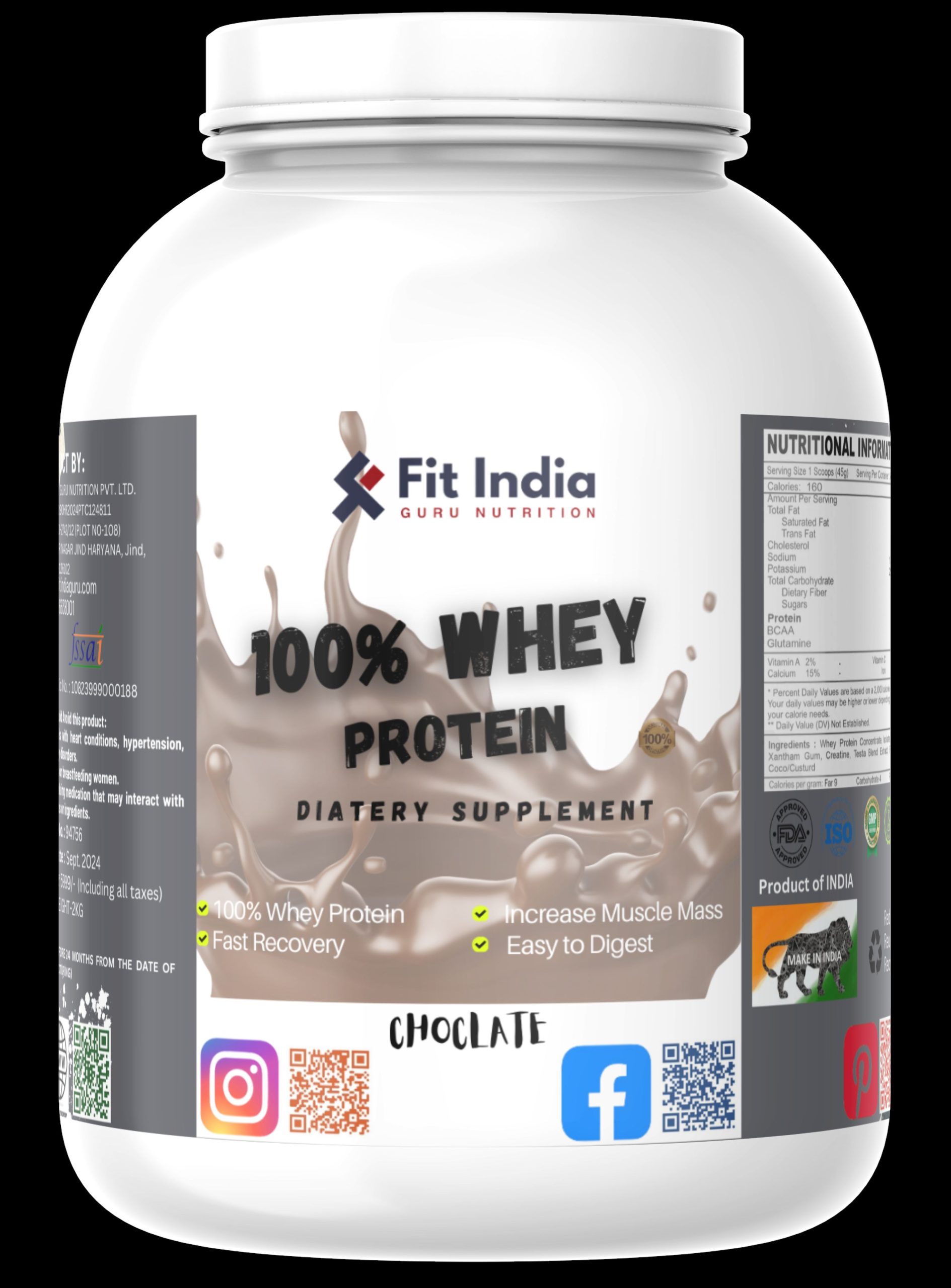 Fit India Guru’s Whey Protein is a premium protein supplement designed to support fitness enthusiasts and athletes in their muscle-building and recovery goals. Formulated with high-quality whey protein isolate, it offers a rich source of essential amino acids that promote muscle growth, repair, and overall health.