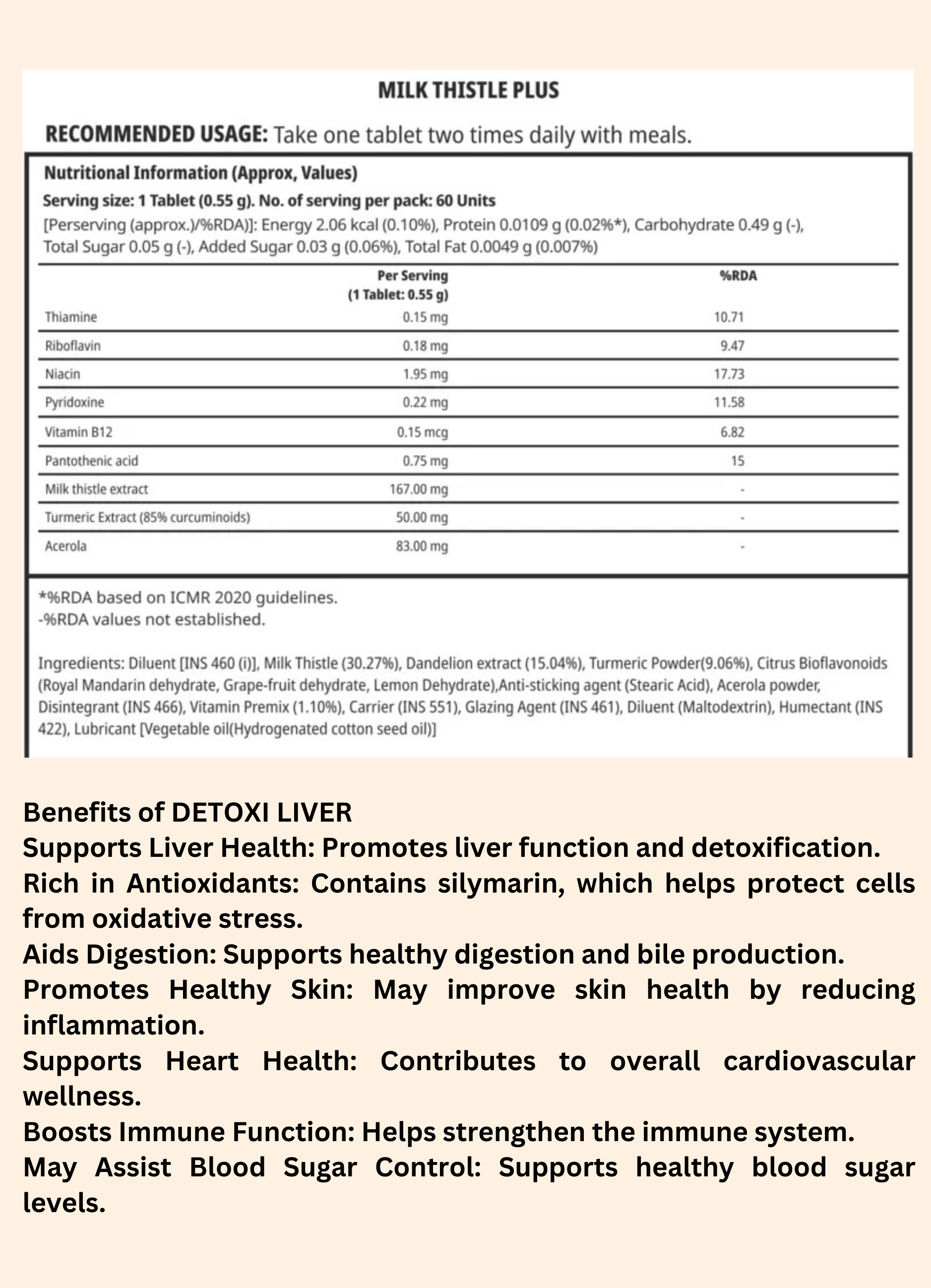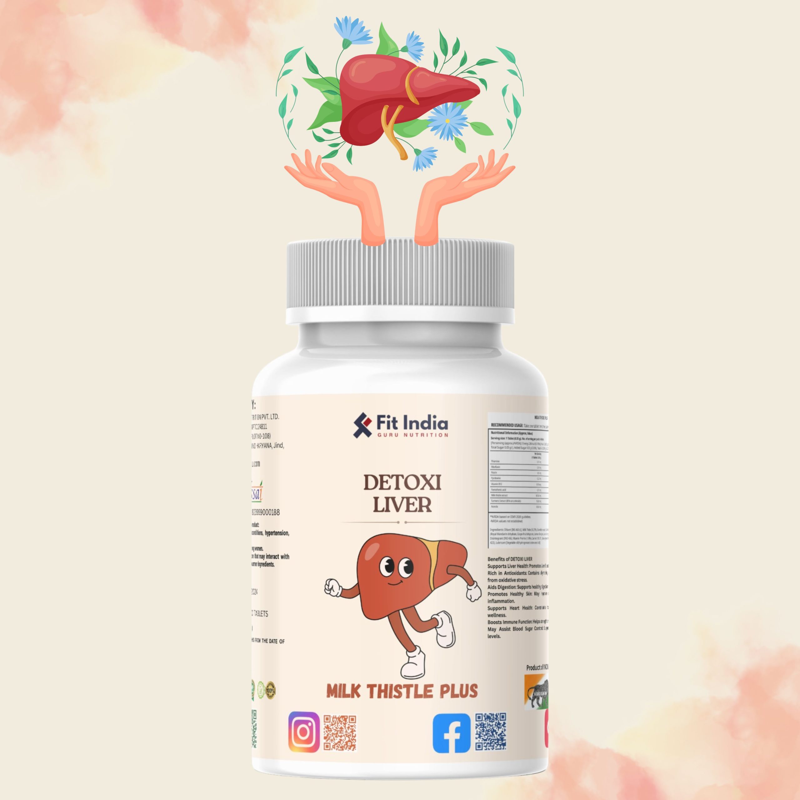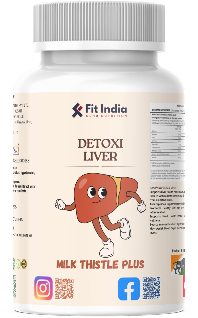 Fit India Guru’s Detoxi Liver is a specialized dietary supplement formulated to support liver health and detoxification. Featuring potent milk thistle extract as its primary ingredient, this product is designed to promote optimal liver function, protect against toxins, and aid in the body’s natural detoxification processes.