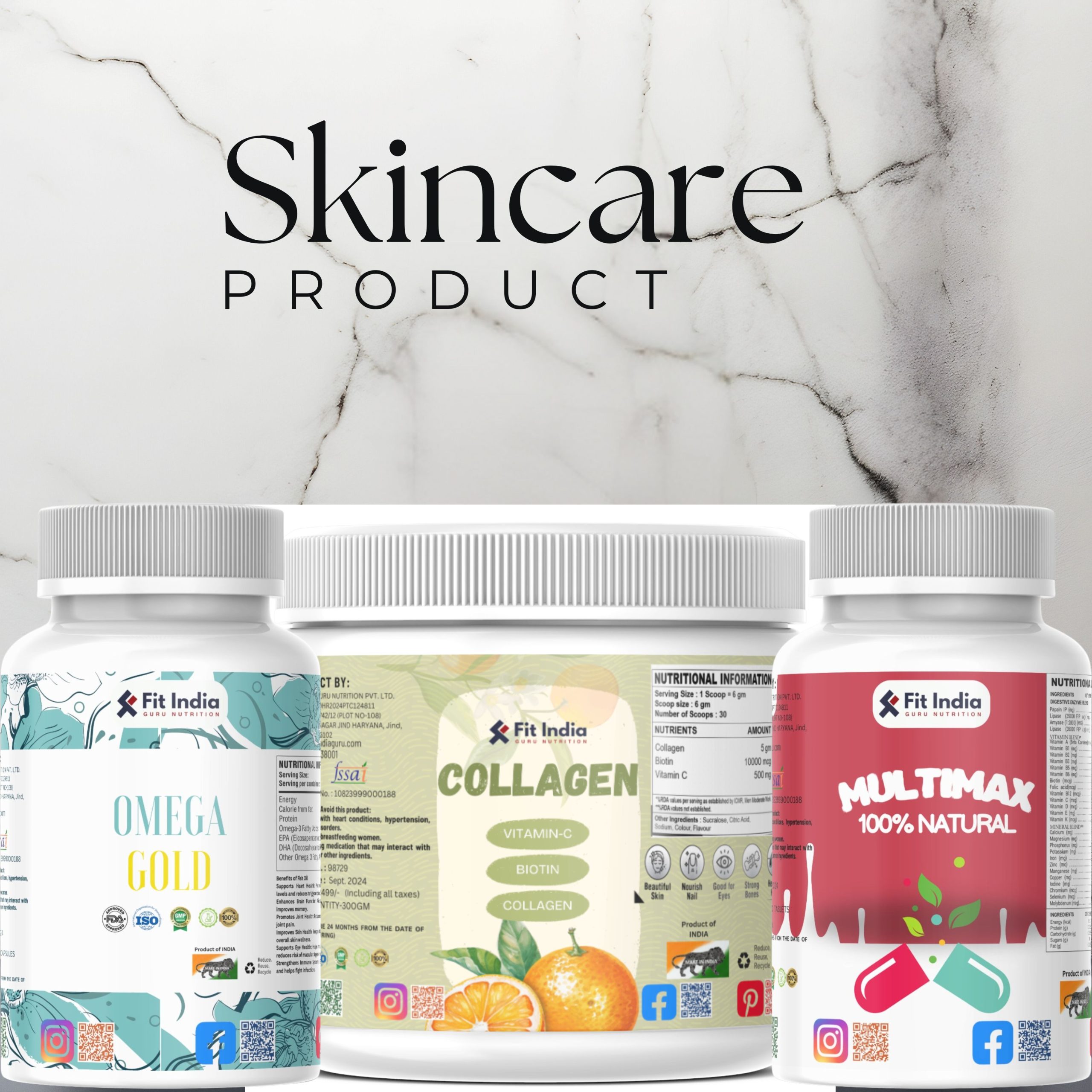 Fit India Guru’s Skin Care Combo is a thoughtfully curated set of three essential supplements designed to promote healthy, radiant skin from the inside out. This powerful combination includes collagen, fish oil, and multivitamins, each targeting key aspects of skin health, overall wellness, and vitality.